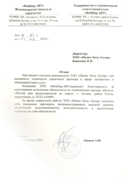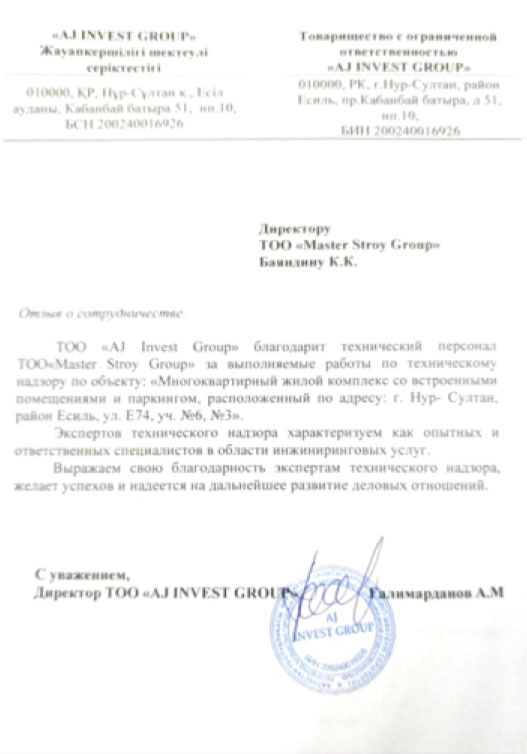 • - Эксперты, осуществляющие «Техническое обследование надежности и устойчивости зданий и сооружений», имеют аттестаты эксперта по экспертным работам и инжиниринговым услугам с правом осуществления деятельности по виду техническое обследование надежности и устойчивости зданий и сооружений, выданные Комитетом Республики Казахстан по делам строительства и жилищно-коммунального хозяйства МИРР РК.